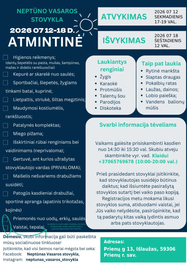 Ieškote įkvepiančios ir įdomios vasaros patirties savo vaikui? Neptūnas Vasaros Stovykla kviečia 8-17 metų smalsuolius jungtis prie mūsų gretų ir puikiai praleisti vasarą!